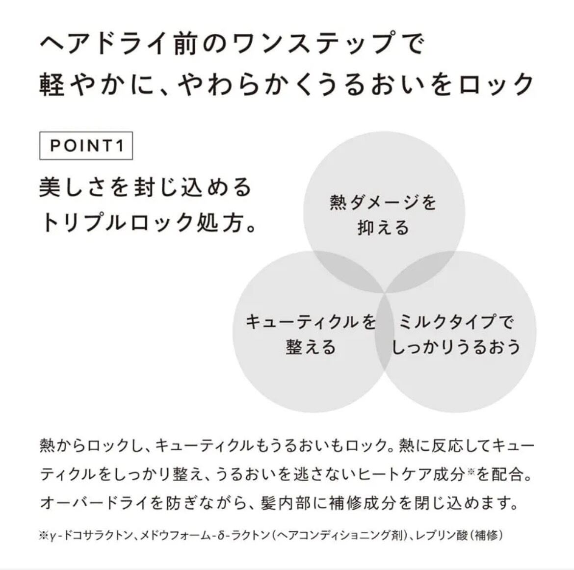 熱に反応してキューティクルをしっかり整え、うるおいを逃さないヒートケア成分※を配合。オーバードライを防ぎながら、髪内部に補修成分を閉じ込めます。